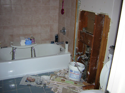 No sooner has he finished the first bathroom and he is on to demo of #2!! As you can see this one isn't as extensive - the shower has already been tiled a few years back and is in good shape- so new sheetrock, new sink, new toilet, new trim and new floor - go DH!!